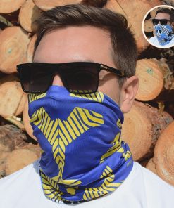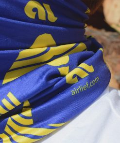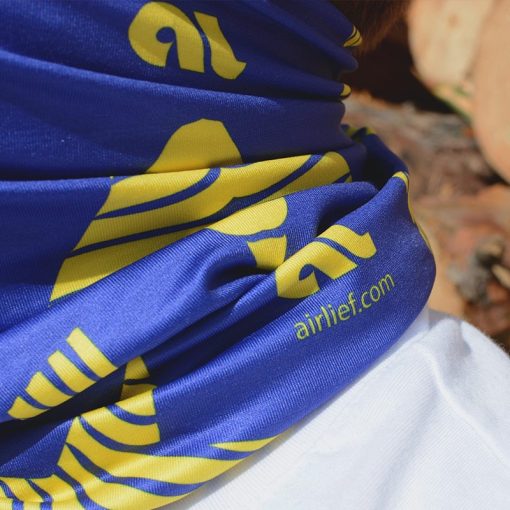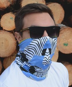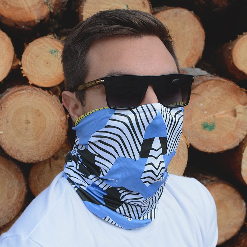 Банданата е двулицева, което дава възможност за лесното ѝ съчетаване с вашето облекло. Дизайнът е инспириран от симетрията, а основният цвят на модела – тъмно синьо и жълто от вечерното небе. От другата му страна ще откриете симетрия в светло синьо, бяло и черно.