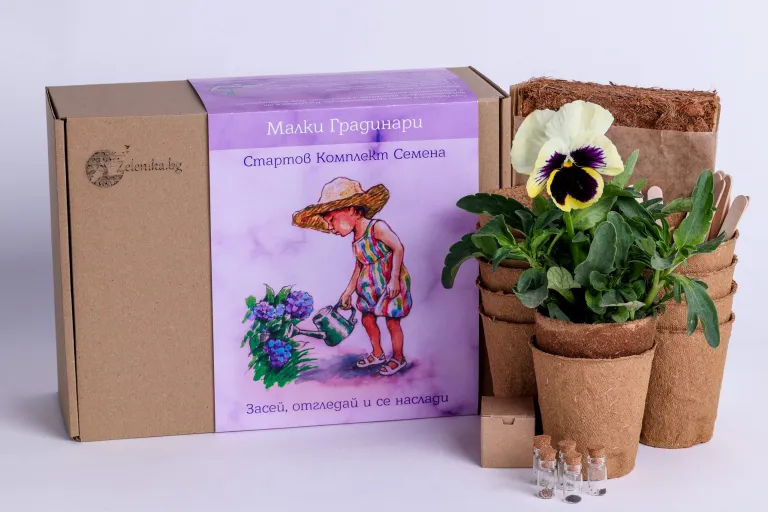 Стартовият комплект ,,Малки градинари“ е идеален подарък за вашето дете. Той е изцяло природосъобразен. Изработен е от висококачествени, екологични и естествени 100% биоразградими и рециклируеми материали. В него ще намерите всичко необходимо за отглеждането на красиви цветя, вкусни зеленчуци и полезни билки. Комплектът дава възможност заедно да отгледате разсад от семена, който след това да засадите в по-голяма саксия или в своята градина. С включените виртуални разходки от България, се стремим заедно да научим децата си да обичат и ценят природата.