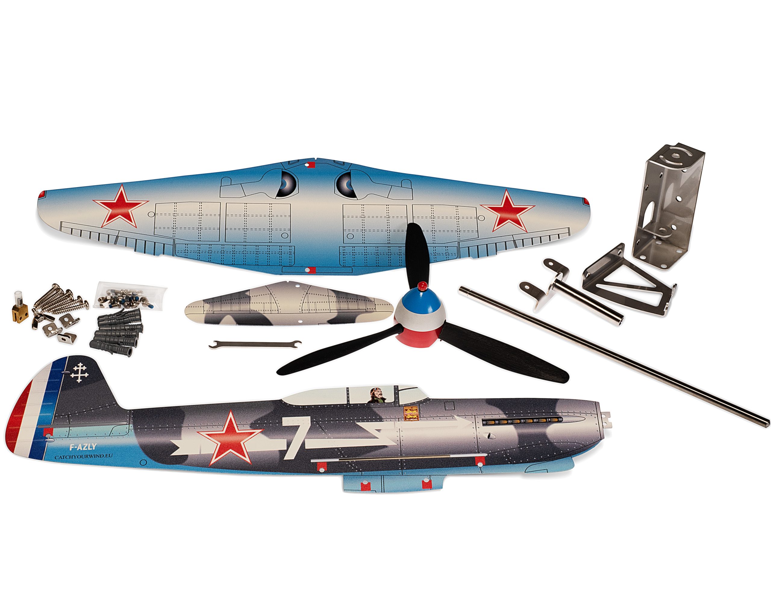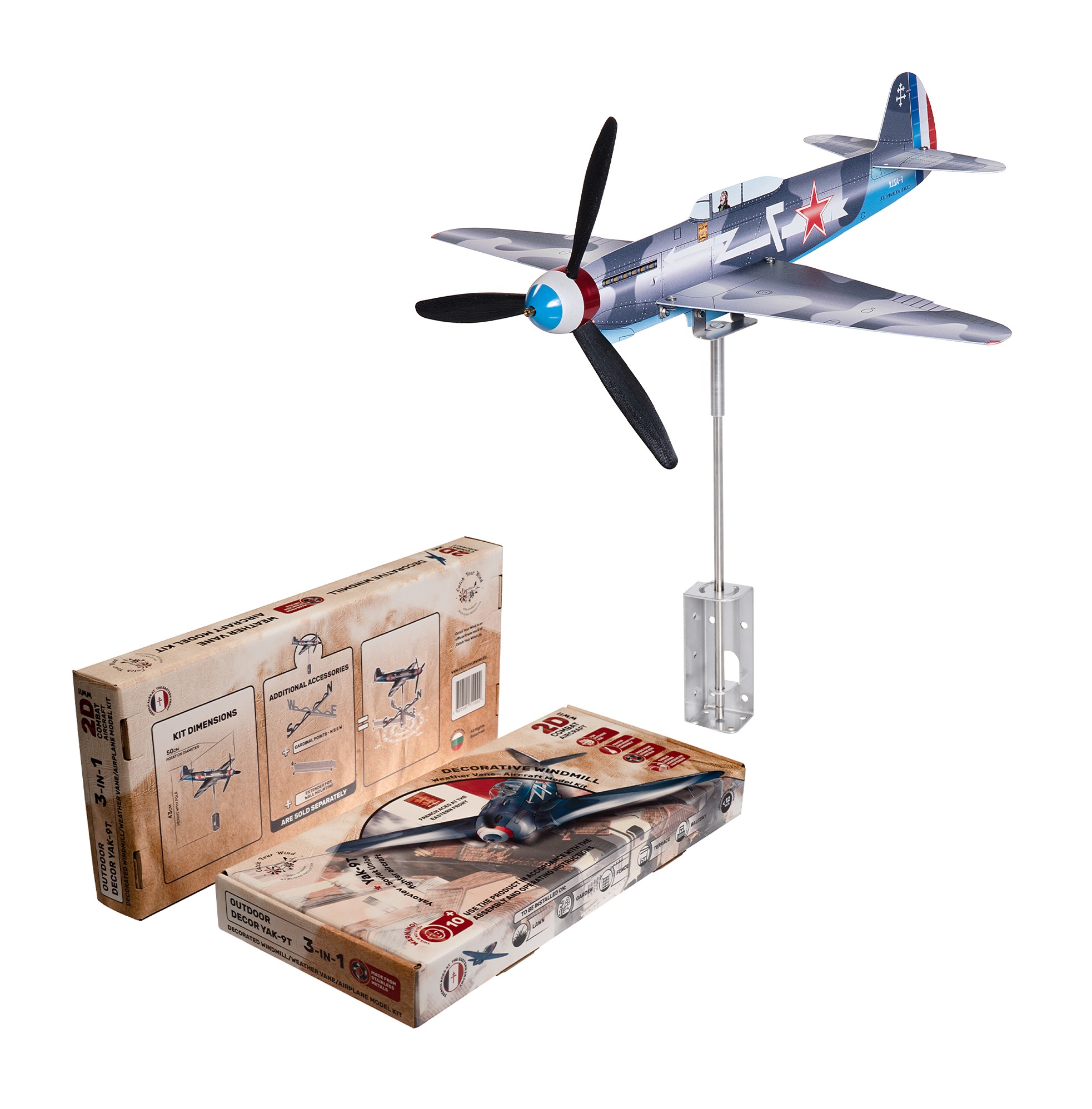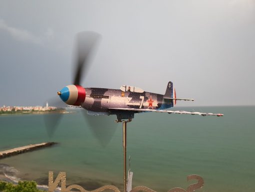 Историческа справка с техническите характеристики на изтребителя Як-9Т и информация за легендарния френски въздушен полк Нормандия-Нимен, изтребител Як9Т (ветропоказател/въртящ се модел/самолет), ос, универсална скоба, стенен държач, крепежни елементи.