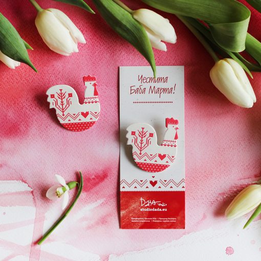 Мартеница от бирен картон с принт – шевици. Модел ПЕТЕЛ. Закопчаване – безопасна игла за брошка. Опаковка – картичка, целофанов плик.