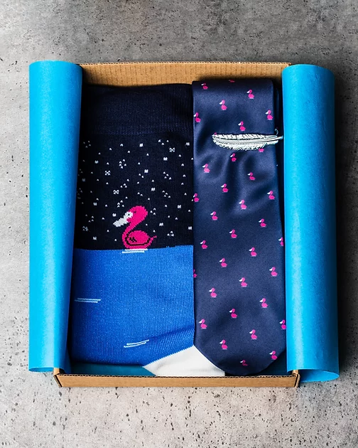 Add our unique matching tie, socks and tie clip set to your wardrobe today.