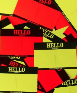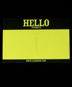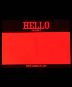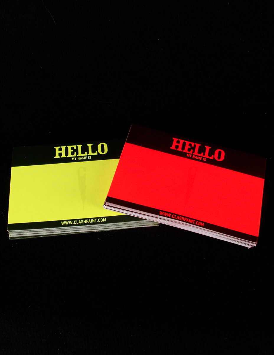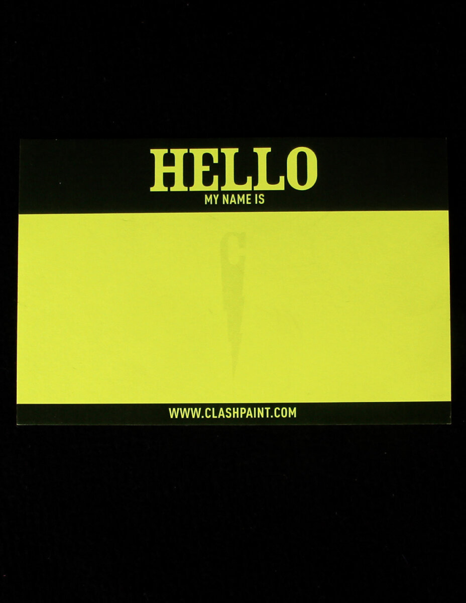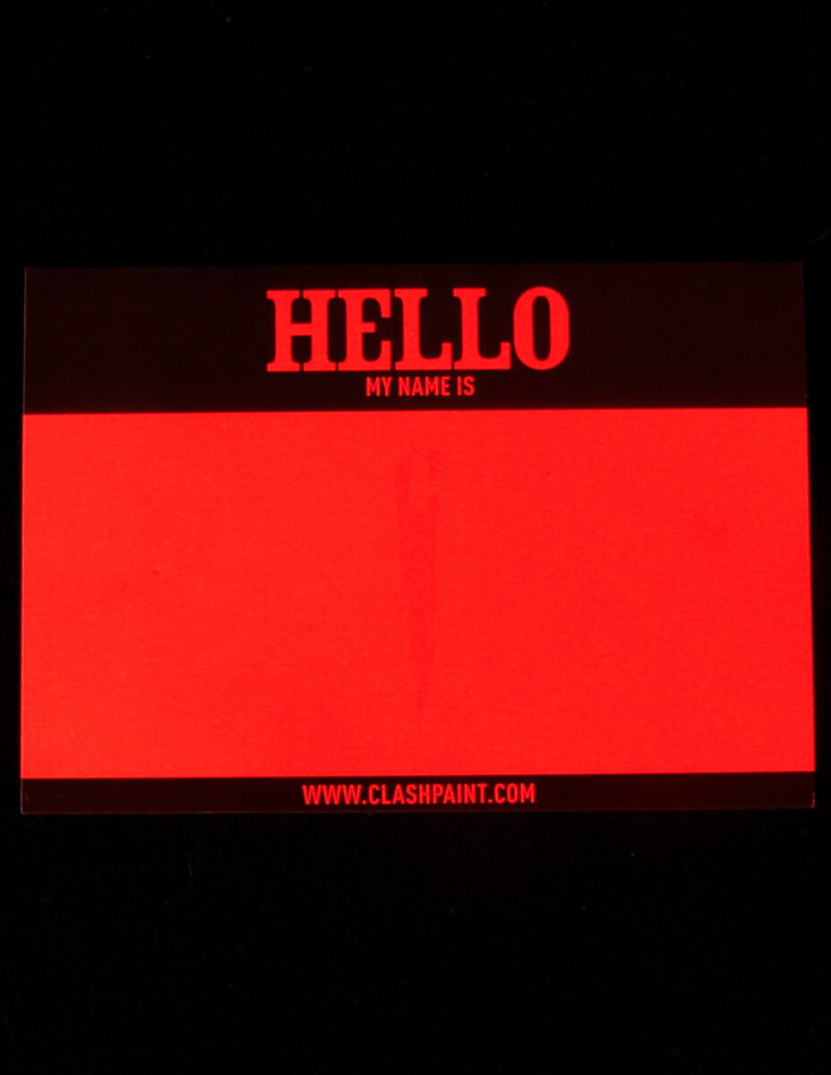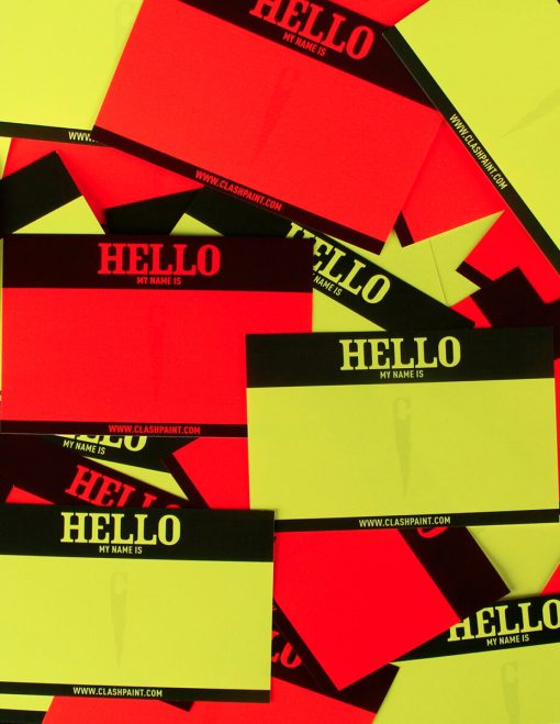 The Clash version of the famous “Hello My Name Is” sticker: a set of 100 outdoor stickers consisting of 50 Fluo Yellow and 50 Fluo Red paper labels.