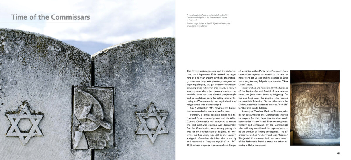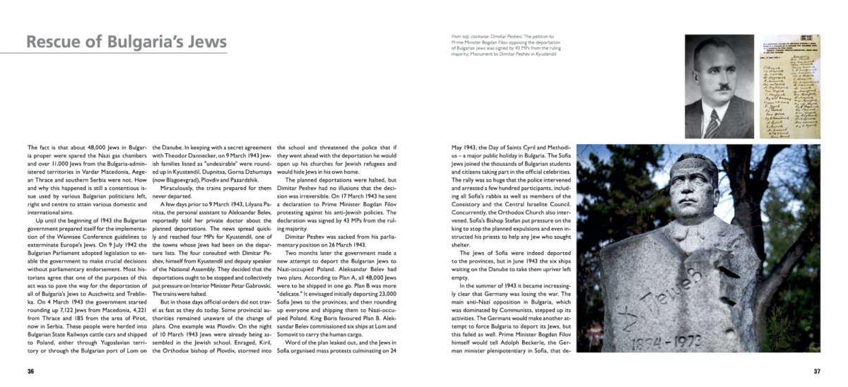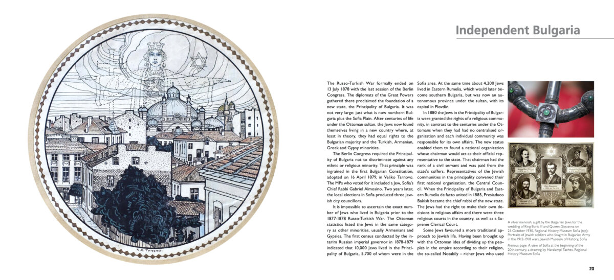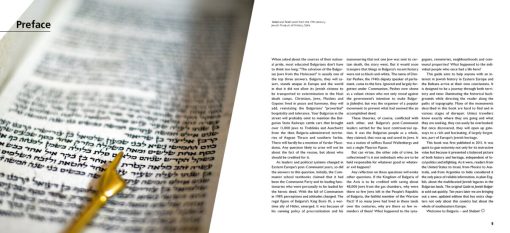 A Guide to Jewish Bulgaria was designed as a “journey through both time and territory.” It contains introductory chapters on early Jewish history in the Balkans, life in the Ottoman Empire (1393-1878), Jewish going-ons in independent Bulgaria (1878-1944), Jewish decline under Communism (1944-1989), and Jewish life post-1989. A special section deals with the famous rescue of the Bulgarian Jews from the Holocaust “paid off” by Jews in Aegean Thrace, Vardar Macedonia and Pirot who were deported to Nazi-occupied Poland.