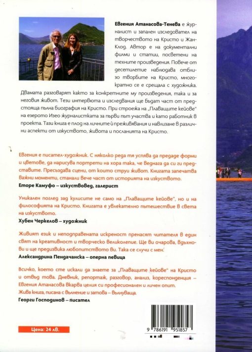 Whether you are tempted or indifferent to the genius of Christo, this book will captivate and intrigue you. The lively language and genuine sincerity of Zheni Atanasova transport the reader into a world of creativity and artistic splendor that will inevitably charm, inspire and arouse your curiosity. That’s what happened to me. I highly recommend it! – Alexandrina Pendachanska – opera singer