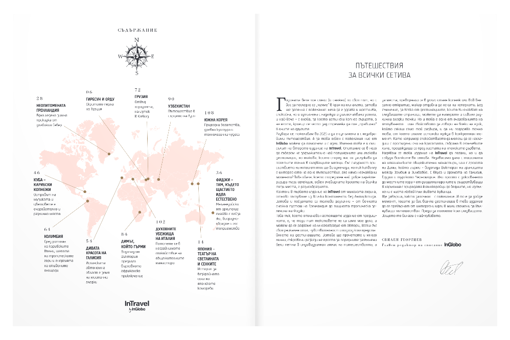 In a new edition of InTravel you will find inspiration for travels in 2025 to various destinations around the world. In this issue, we talk about the Black Sea coast of Turkey, the sights and wine of Georgia, the Camino de Santiago pilgrimage route and the wild landscapes of Galicia, the snowy wasteland of Greenland, the music and life of Cuba, the rainforests and coffee of Colombia, the coral reefs of Fiji, the light of Japan, the tranquility of Italian monasteries, Victoria Falls, the cities of Khiva, Bukhara and Samarkand in Uzbekistan and the contrasts of South Korea.