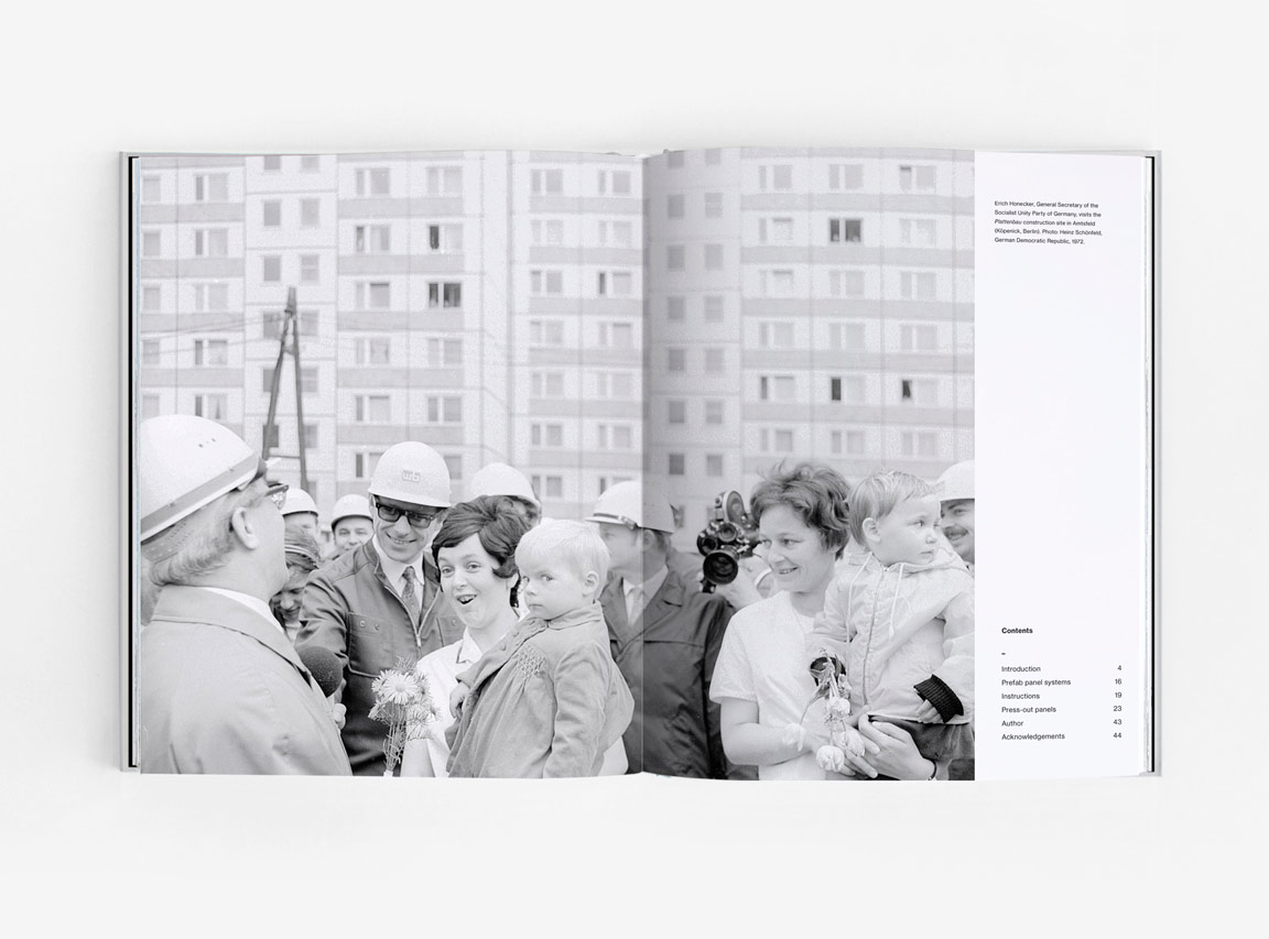 The first part of the book opens with an introduction to mass housing in the former Soviet Union and its satellites, illustrated with photographs and propaganda posters. The second part contains 164 cardboard panels to press out and build a 27-cm-high 3D block with easy-to-follow instructions. The panels feature detailed illustrations recreating the facades of post-war modernist housing units, which are home to millions of city dwellers to this day.