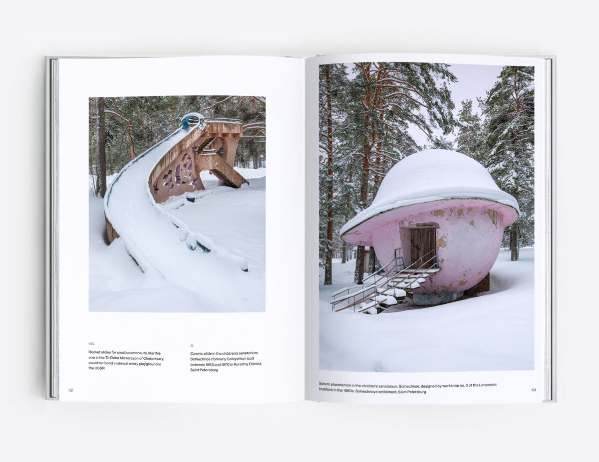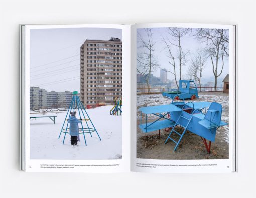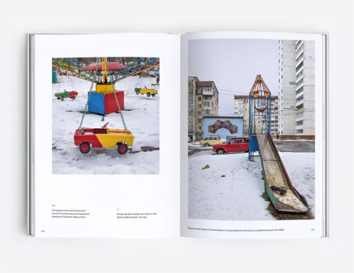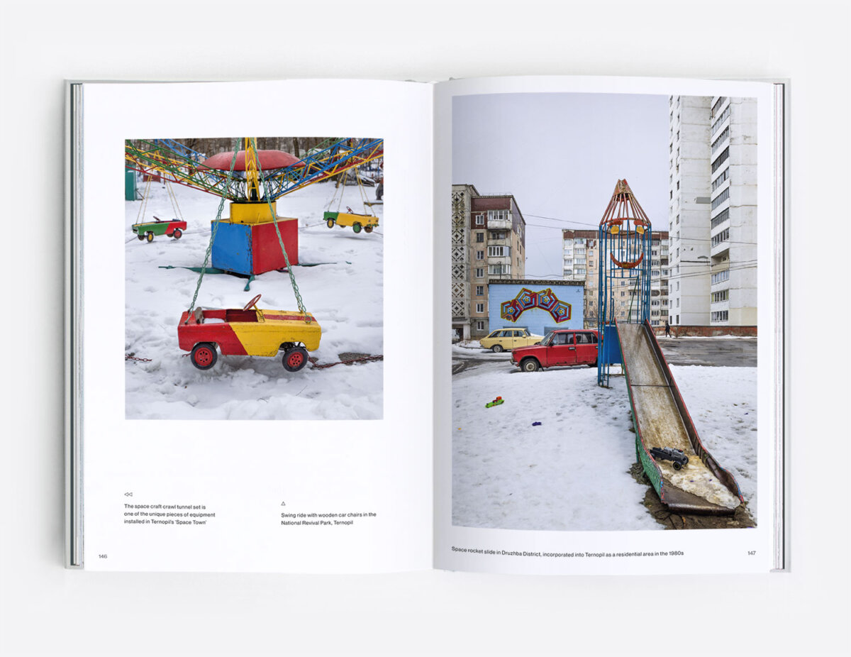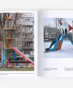 Through five chapters containing more than 150 photographs, the book documents the mass-produced, yet diverse play equipment installed in the communal spaces of socialist-era housing estates, such as rocket slides and earth-shaped climbers, spaceships and animal-themed ladders, cosmic roundabouts and bizarre objects that would probably raise safety concerns nowadays.