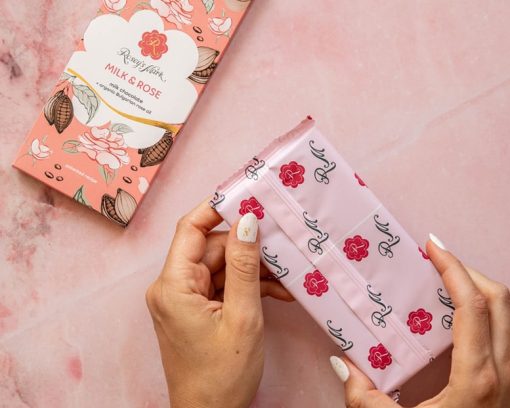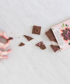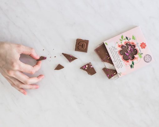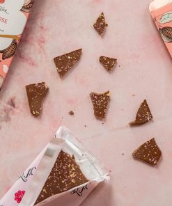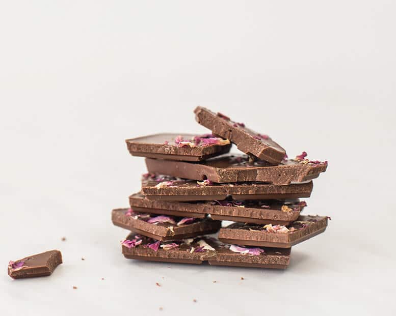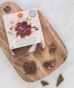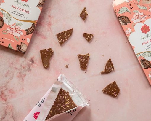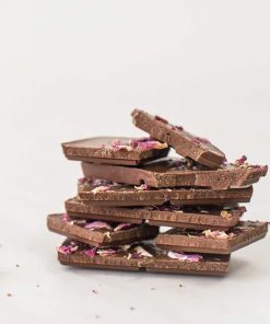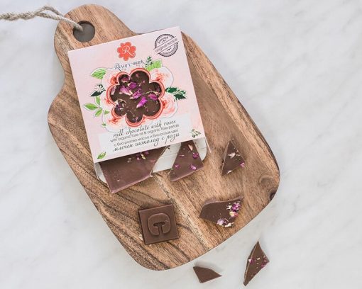 Ingredients: sugar, cocoa butter, milk powder, cocoa mass, sunflower lecithin, vanilla, organic rose petals, organic rose oil.