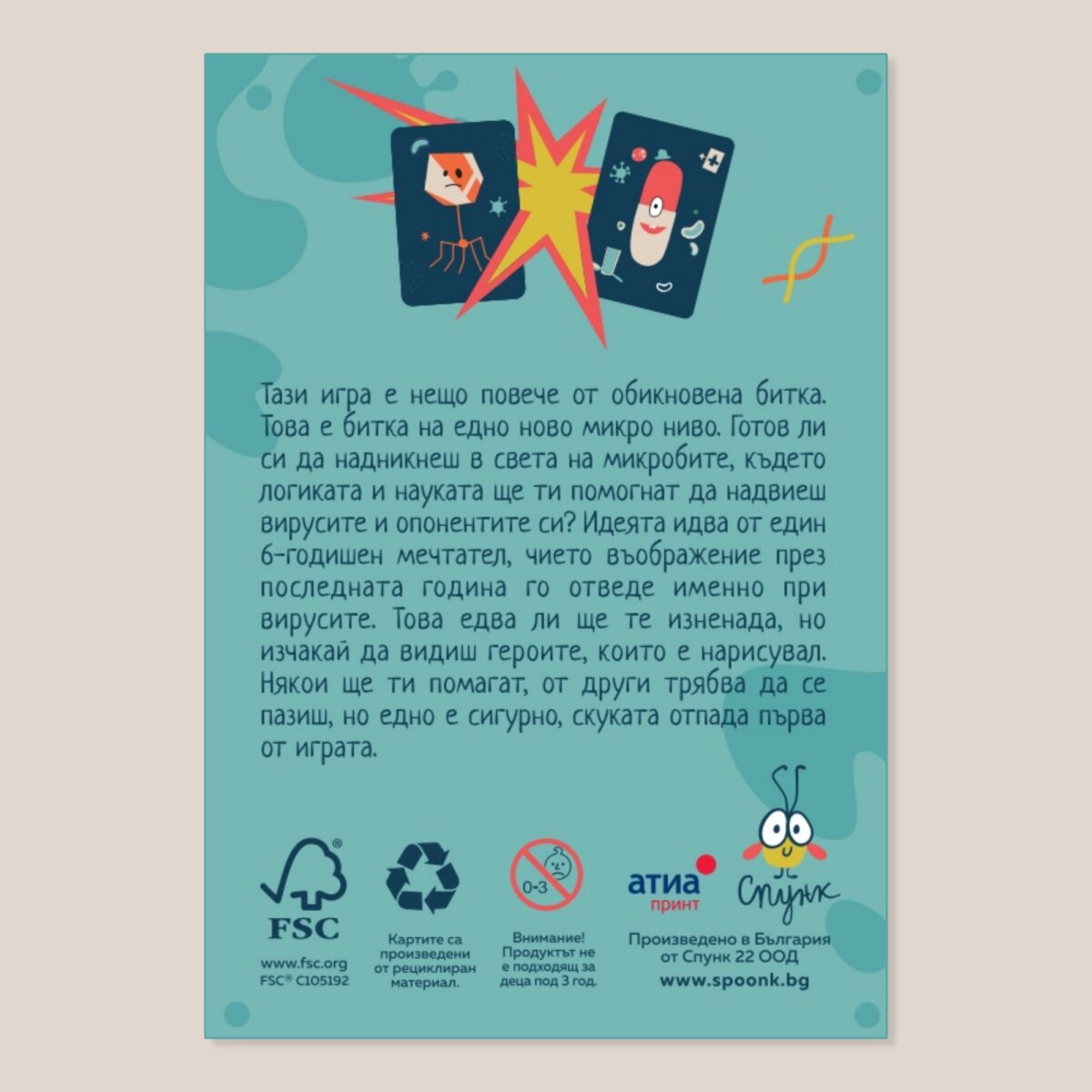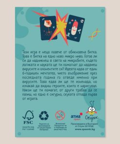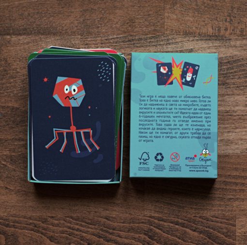 “Micro Battles” is a Bulgarian board game based on the idea and drawings of a 6-year-old child who was locked up at home because of a well-known virus. Different cards and card combinations help you protect yourself from the constantly attacking viruses, following the logic of real life. If you run out of cards to protect you, you are out of the game. The goal is to stay until the end, defeating every virus that comes your way.
