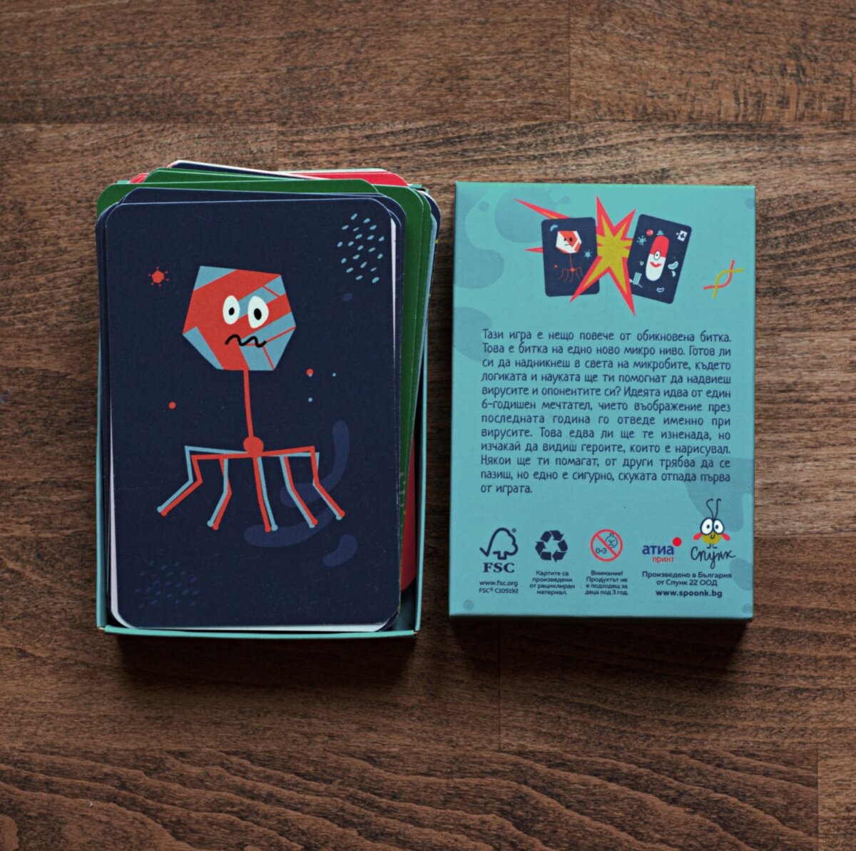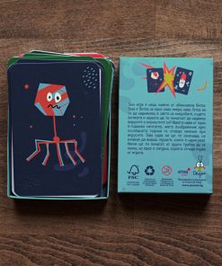 The cards and the rulebook are made from 100% recycled material, and the box is made from FSC certified cardboard. The game is created and produced entirely in Bulgaria.