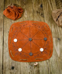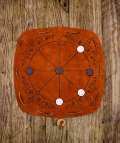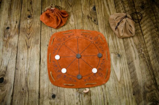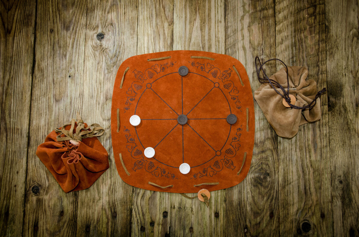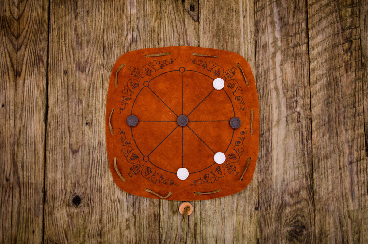 The game ROTA is part of a series of reconstructions of historical games, handmade from natural materials in the DABRAVA studio. The game board is made of leather suede, with ceramic or glass checkers. The game folds up and ties into a lightweight bag, convenient for storage, carrying and playing anywhere.