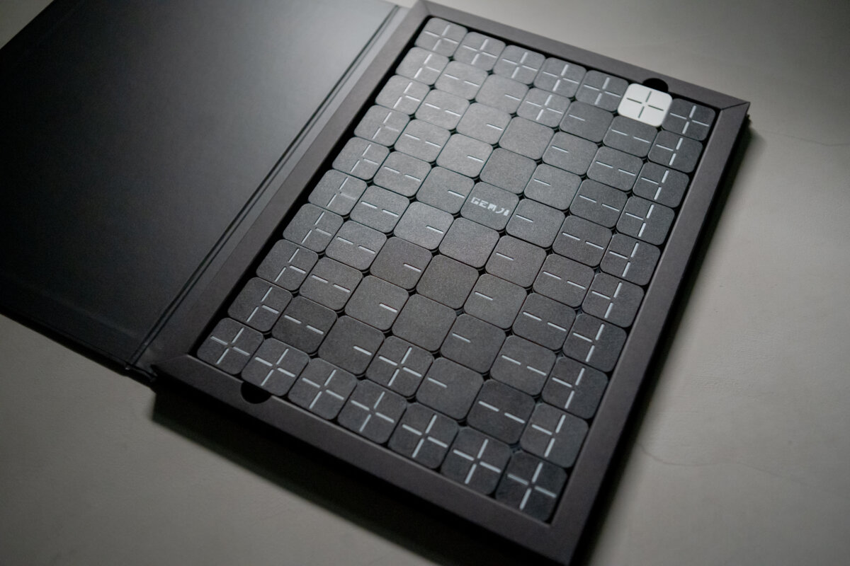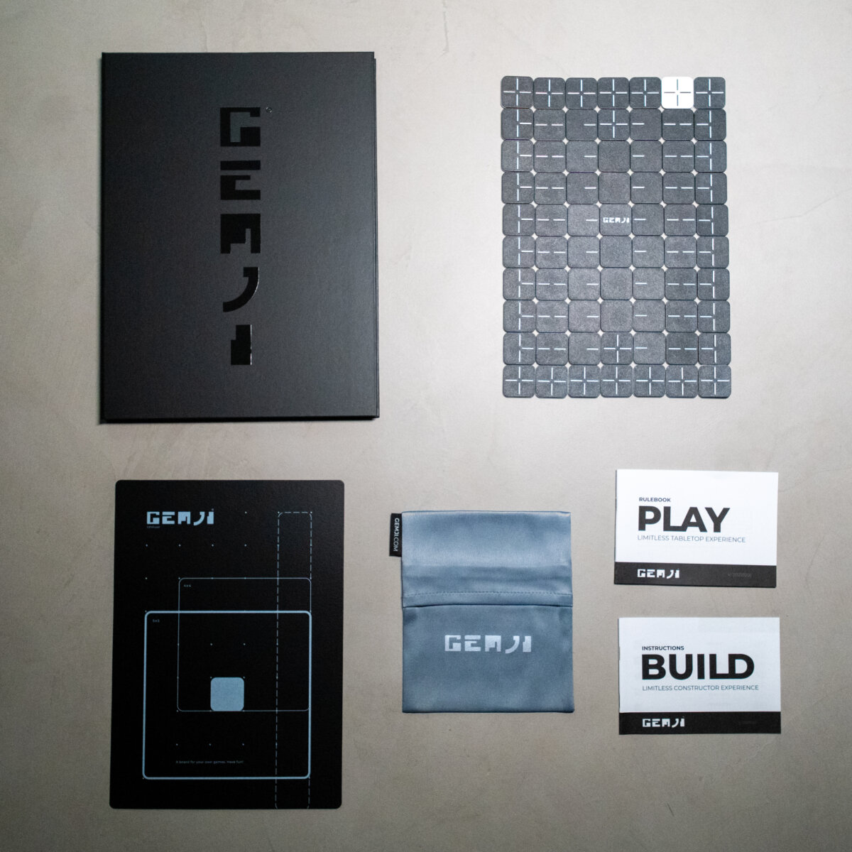 The GEMJI Original Set Box includes 70 magnetic tiles, a playing board, travelling pouch, and rulebooks with 21 games & building instructions for 7 constructions.
