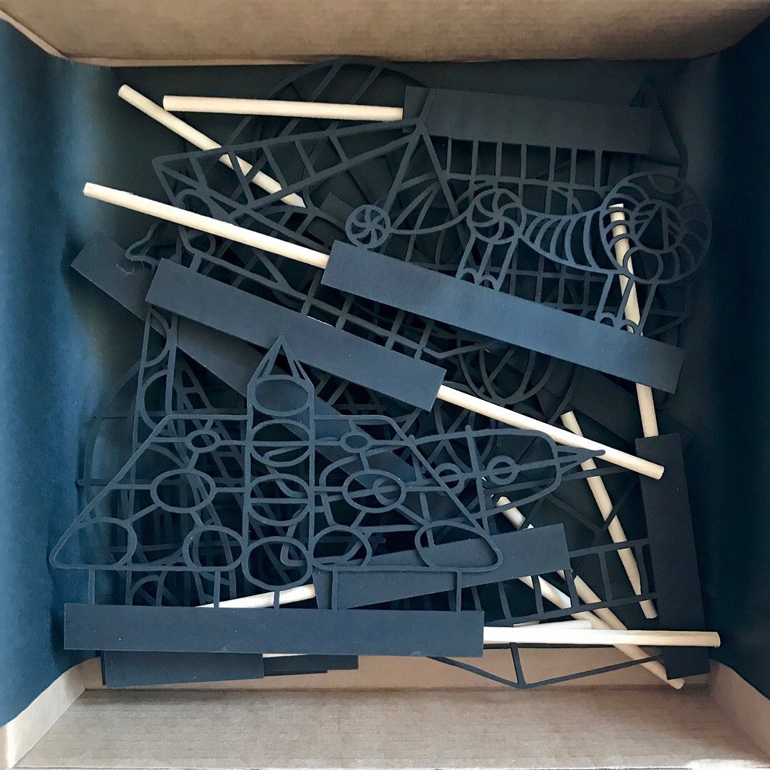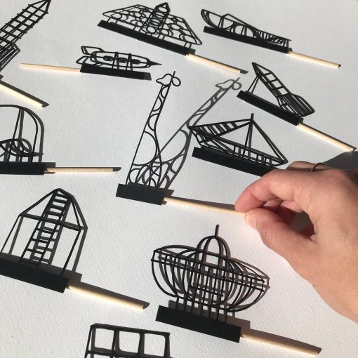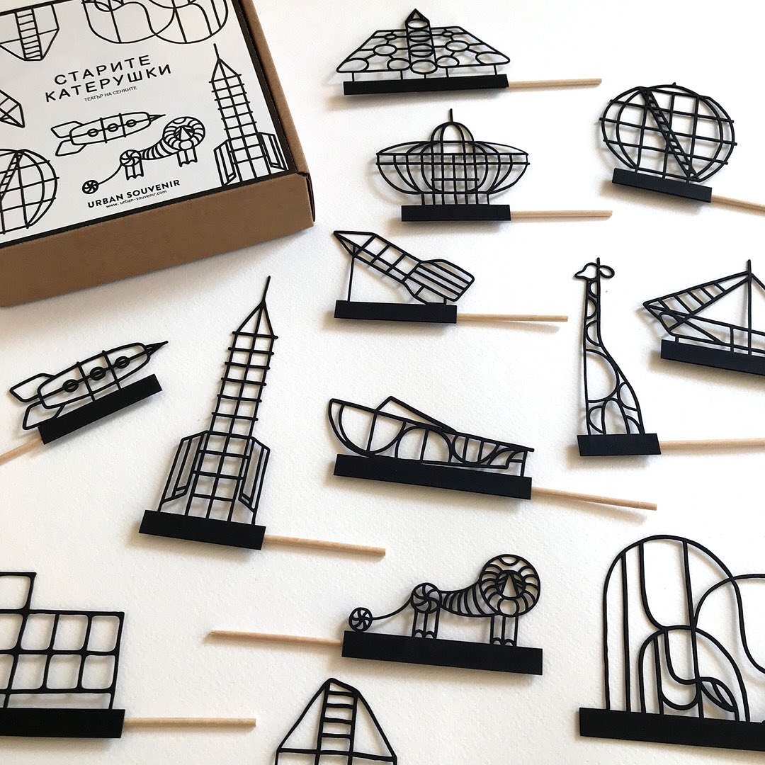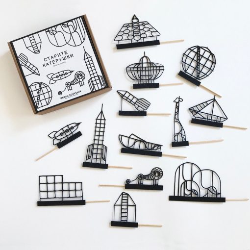 13 silhouettes of old playgrounds on a stick in cardboard box, 15×15 cm. For kids above 3 years.