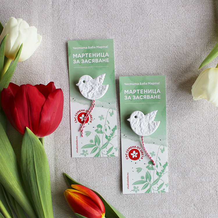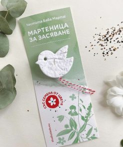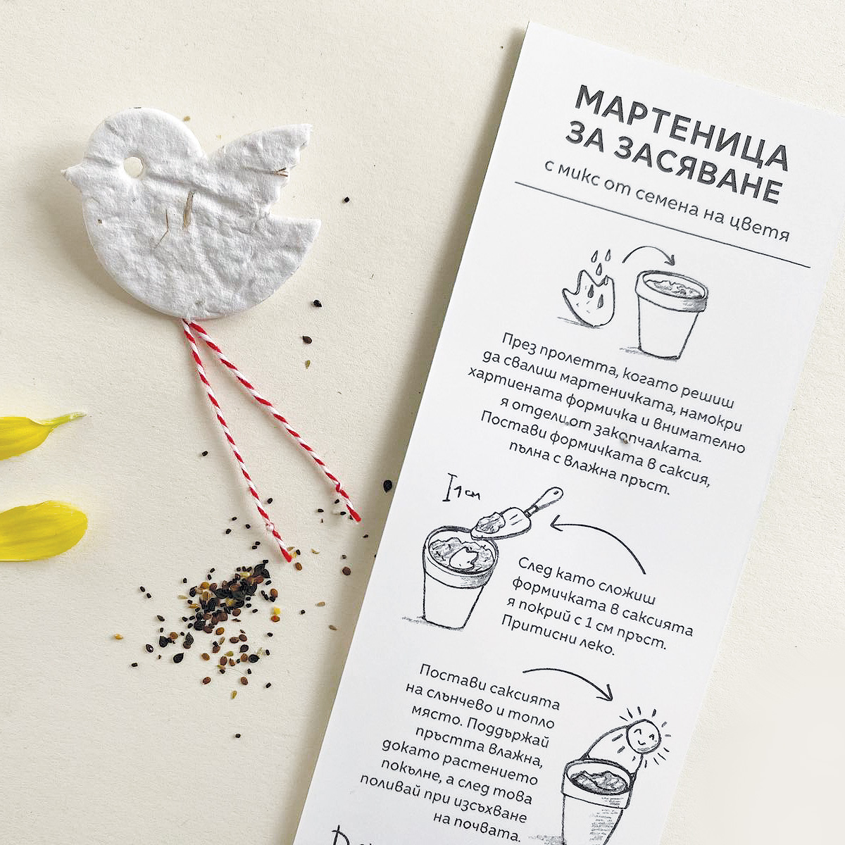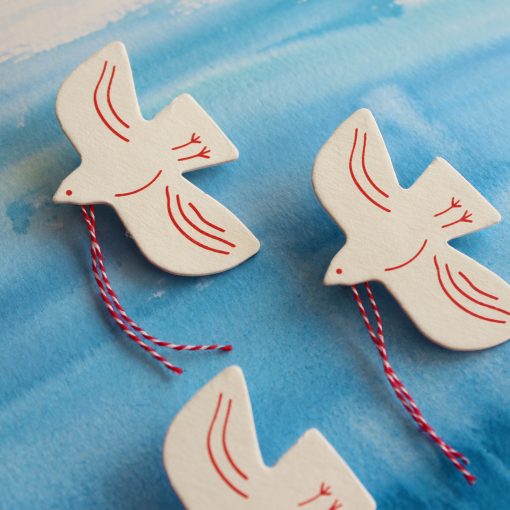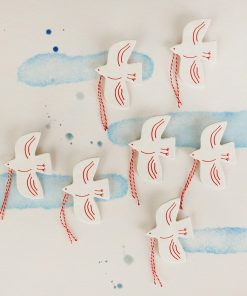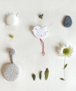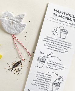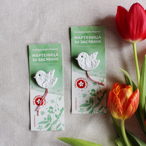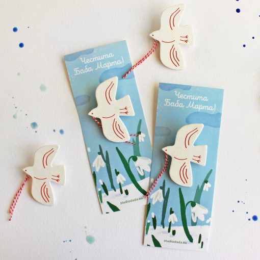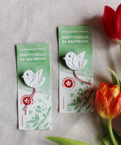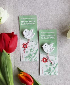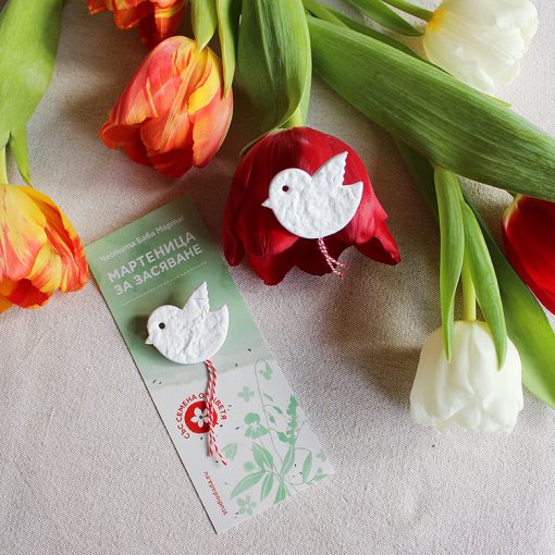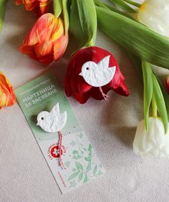 Martenitsa made of beer cardboard in the shape of a stylized bird. Fastening – safety pin for brooch. Packaging – card, cellophane envelope.