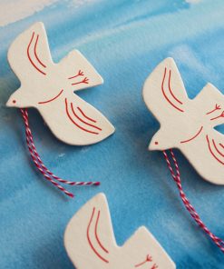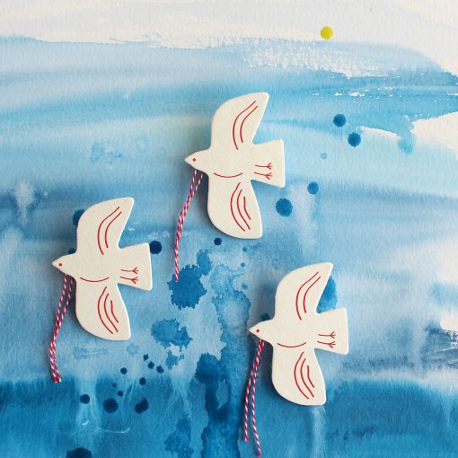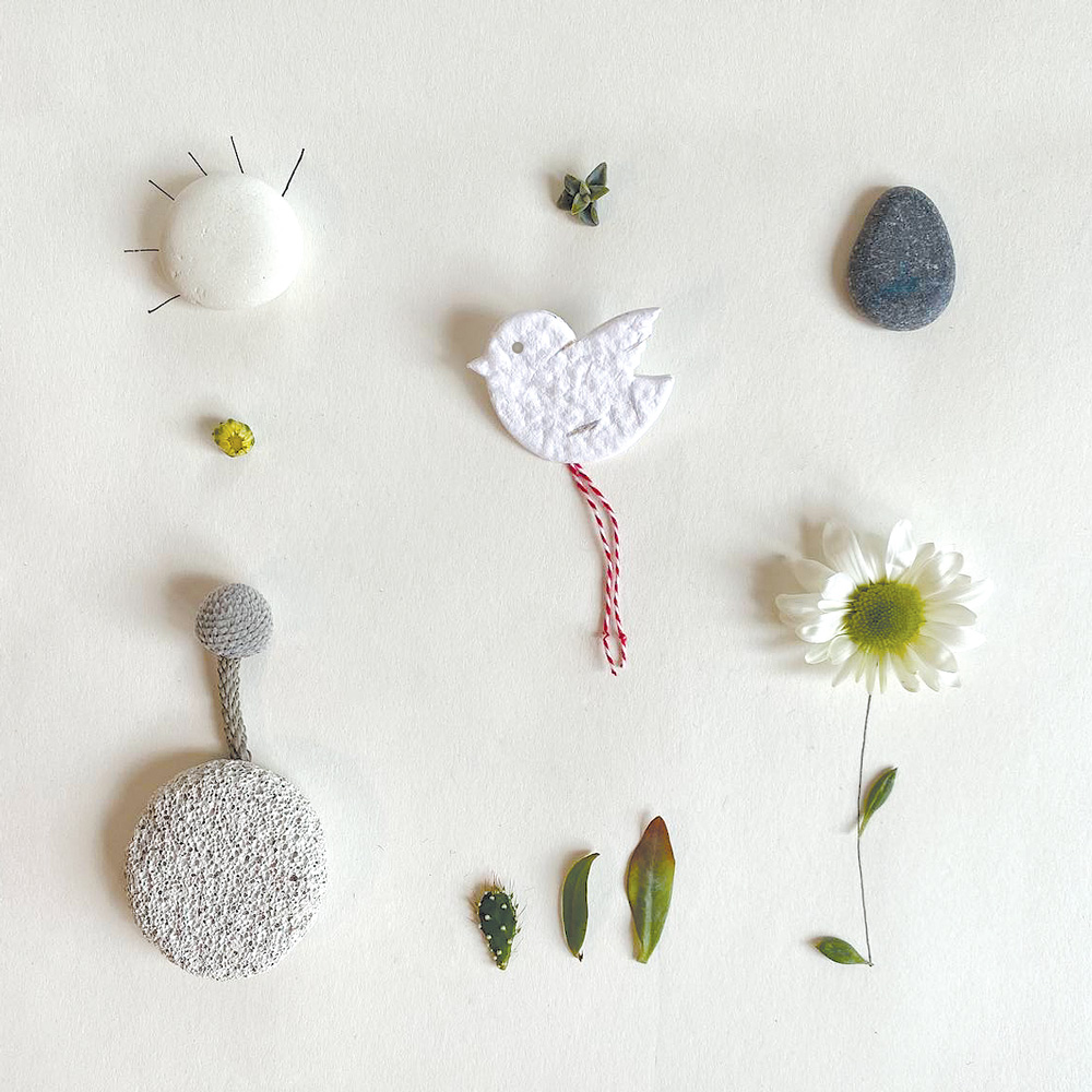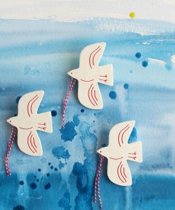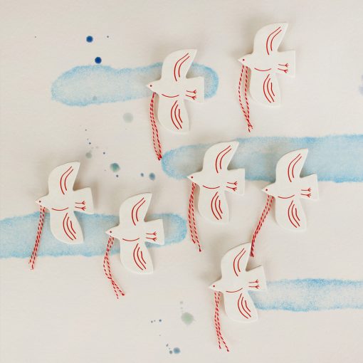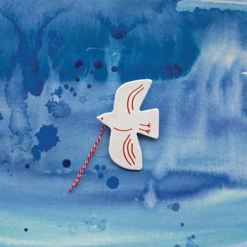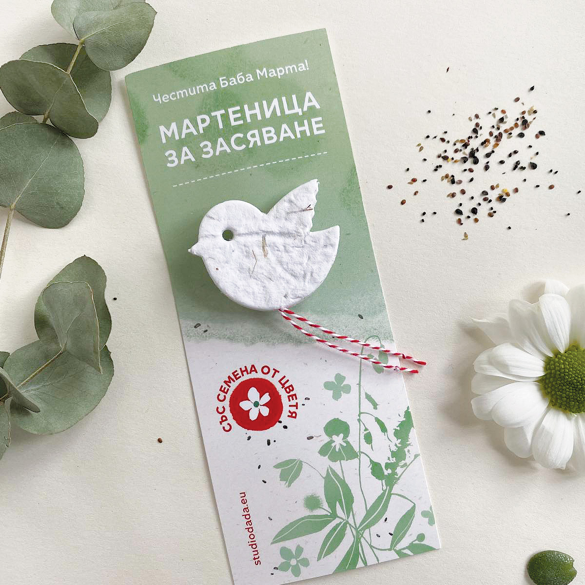 Martenitsa made of beer cardboard in the shape of a stylized bird. Fastening – safety pin for brooch. Packaging – card, cellophane envelope.